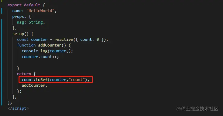 toRef:可以用来为源响应式对象上的某个 property 新创建一个 ref。然后,ref 可以被传递,它会保持对其源 property 的响应式连接